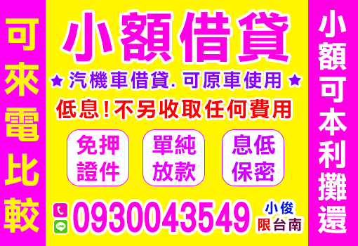 台南借款證件小額借錢e借通,小額借貸可本利攤還,汽機車借貸,可原車使用,低息,不收取任何費用,歡迎來電比較